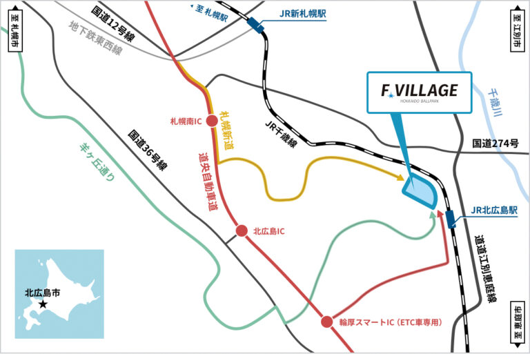 手稲区・北区・東区・白石区・厚別区方面からは、国道274号より札幌新道・大曲通・きたひろしま総合運動公園線ルートを推奨