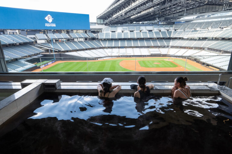 “フィールドを一望できる球場内天然温泉とサウナ”は世界初。半屋外の水着着用ゾーンには、フィールドを見下ろす24席の“ととのえテラスシート”があり、サウナ室や浴槽からも試合を見ることができるエンターテイメント性ふれる温浴施設。