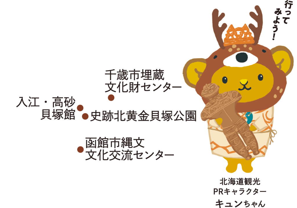 函館市縄文文化交流センター、史跡北黄金貝塚公園(北黄金貝塚情報センター)、入江・高砂貝塚館、千歳市埋蔵文化財センターの4カ所すべてのスポットを集めると応募できます。