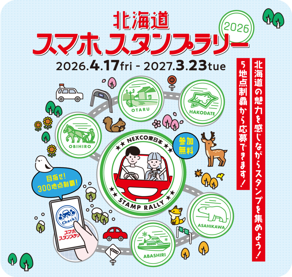 NEXCO東日本が主催する地域PRイベント「北海道ハイウェイShowArea」を2026年も開催します。今年もイベント会場でしか取得できない「イベント限定スタンプ」が登場!スタンプ取得ポイントでスマホをかざすと取得できます。詳細は「ドラぷら」および北海道スマホスタンプラリートップページのお知らせ欄をチェック!